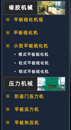 本公司生產的橡膠平板硫化機組,具有設計合理,制造精細、操作簡單、維修方便、生產效率高等特點。特別是PLC程序控制硫化機更具有現代自動控制等特色。
